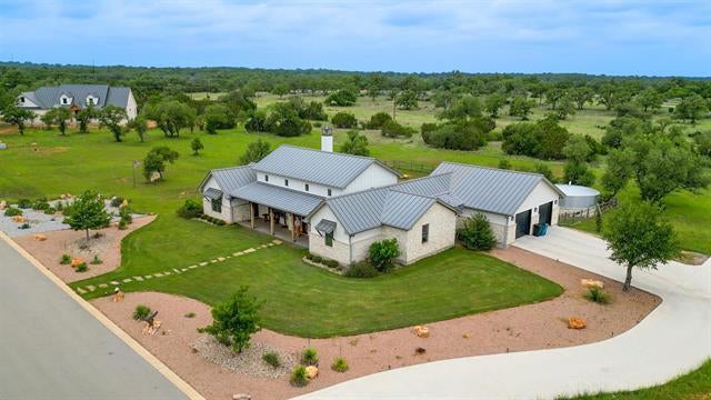 Modern Hill Country Farmhouse is located in the special, wonderful community, Trinity Oaks Preserve at Round Mountain. Perfectly located between Spicewood, Marble Falls, & Johnson City at the head of the Texas Wine & Culinary Trail! This peaceful & private community is golf cart/ATV friendly for enjoying the outdoors. This retreat sits on a level, 3-acre property with live oaks, native grasses wildflowers, and diverse wildlife. Thoughtfully designed for both comfort & functionality, the home is an entertainer's dream, with a spacious open layout and extensive outdoor amenities! Great room with stained Alder beamed cathedral ceilings throughout, shiplap wall treatments, linear fireplace, and floor-to-ceiling wall of windows for bringing the outside in. High-end appliance, lighting, & plumbing package. Mudroom accessible from garage & rear porch with built-in storage. Outdoor features: Wood-burning fireplace, DCS gas grill, sink, side burners, storage, & custom-built smoker! Wood Railing & wire fencing. Rainwater harvesting system with 14,500 holding tank,& gutter system, underground utilities, metered water from community water system, PEC electric, Spectrum high-speed internet, phone, cable, & Whole House Generator! Huge two-car garage perfect for Trucks/SUVs, Storage, & Workshop. The proximity to medical, local wineries, charming small towns, and outdoor recreational opportunities further enhances its appeal for those seeking a quintessential Hill Country lifestyle. You will love Trinity Oaks Preserve.