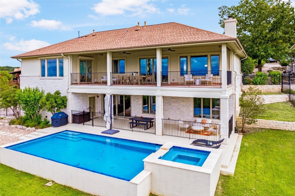 Step into your dream home located on just under 1/2 acre in the serene lake community of Lago Vista! This stunning 4 bed, 4 bath luxury residence boasts exquisite designer finishes, including gorgeous Saltillo tile. Upon entering you will be welcomed by soaring ceilings, an open-concept layout, and expansive windows that flood the home with natural light. The gourmet kitchen features high-end appliances including a built-in microwave and second oven, custom cabinetry, and a large center island perfect for entertaining. Take pleasure in dining in a spacious dining area, while relishing in the panoramic views of the hill country. The generous living room includes an attractive fireplace, and leads directly onto the upper balcony, the perfect place to take in phenomenal sunsets. The primary suite is situated on the main level, with private access to the balcony. The spa-like ensuite bath includes a double vanity, inviting soaking tub and a separate walk in shower. A secondary bedroom and full bath are also conveniently located on the main floor. The lower level of the home offers a second living area that leads out onto an oversized covered deck. Two additional bedrooms and two intricately designed full baths are also located on this level. The resort-style, heated infinity pool provides year round enjoyment! A 3 car garage allows for plenty of space for cars, entertaining areas and/or a workshop. The 2 sets of washers and dryers located in this area convey with the sell of the home. For ease of lawn maintenance, an automatic sprinkler system services both the front and back yards. Owning this home includes membership to the Lago Vista POA, allowing exclusive access to 9 private waterfront parks, basketball court, boat ramps, campground, disc golf course, fishing well, fitness center, hiking trail, marinas, parks, pavilions, pool, athletic field, tennis courts, pickle ball courts, playgrounds and more! This property can also be used as an STR.