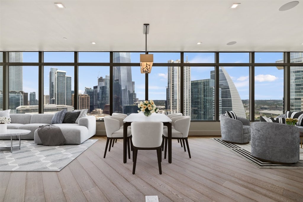 Great location and great panoramic views overlooking the Capitol View Corridor, one of the city's most protected corridors. This exceptional residence, #2303 is 3 bedrooms, 3.5 baths, with floor to ceiling windows, motorized shades, two private terraces and over 2800 SF with an open floor plan. All windows and glass doors are upgraded improving energy efficiency and providing a more comfortable interior. The chef's kitchen includes Miele appliances, a Wolf induction cook-top, Sub-Zero refrigerator as well as a wine fridge, and pantry. The primary bath has dual vanities, a frameless walk-in glass shower, large tub, Toto toilet and two walk-in closets. The unit has wide plank white oak floors, Nest thermostats, USB outlets, keyless entry, Sonos/surround sound, two premium parking spots with two electric vehicle chargers. Four plasma Sony televisions with sound bars and amps are included. Fifth & West offers resort style amenities with a state of the art gym, a work lounge, a party space with a catering kitchen, wonderful pool with great views, a dedicated dog park and guest suites for your friends. The live music capital, diverse food scene, outdoor recreational attractions, and cultural options are right outside your front door. Enjoy and explore downtown including Austin Central Library, Lady Bird Lake, the hike and bike trail, Book People, Whole Foods, many great restaurants and of course all the live music venues.