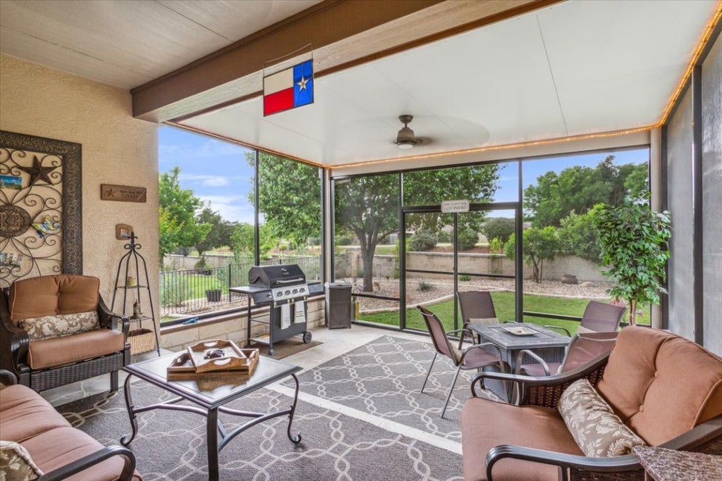 This beautifully appointed residence combines timeless craftsmanship with modern upgrades, creating a private retreat with no neighbors behind. From the moment you arrive, the charm is undeniable—custom leaded glass accents the front door, office, and kitchen, setting the tone for the elegance throughout. Inside, crown molding adds sophistication to most rooms, while bamboo wood flooring flows through the office, den, and living room. In the bedrooms, luxury vinyl wood floors provide both comfort and durability. The updated kitchen is a showpiece, featuring glass-front white cabinets, granite counters, stainless steel appliances, a 36" gas cooktop, pendant lighting over the breakfast bar, and a convenient touch faucet—an ideal space for both cooking and gathering. Sliding doors from the breakfast nook open to a two-level screened porch with ceiling fans—perfect for entertaining or simply enjoying serene mornings with peaceful views of the low-maintenance xeriscape backyard. The second bedroom can accommodate a king size bed and has a large closet. The 2nd bathroom can be accessed from the hall or privately from the bedroom. The primary suite feels like a spa retreat, offering a seamless glass shower with designer tile surround, a soaking tub, and raised counter and commode for comfort. Practicality is just as impressive: Utility room with sink and storage cabinets Extended garage with temperature-controlled heat exchange system, overhead storage, rubber flooring, and water softener Textured finish on driveway, walkway, and front porch Additional updates include: 2021 tankless water heater 2020 roof Solar screens Ring security system with front and back coverage + exterior cameras Located in Sun City, you’ll have access to 4 activity centers, 3 golf courses, and more than 100 clubs and organizations—something for every interest and lifestyle. This home truly has it all—style, comfort, function, and community. You’ll wish you moved here sooner!