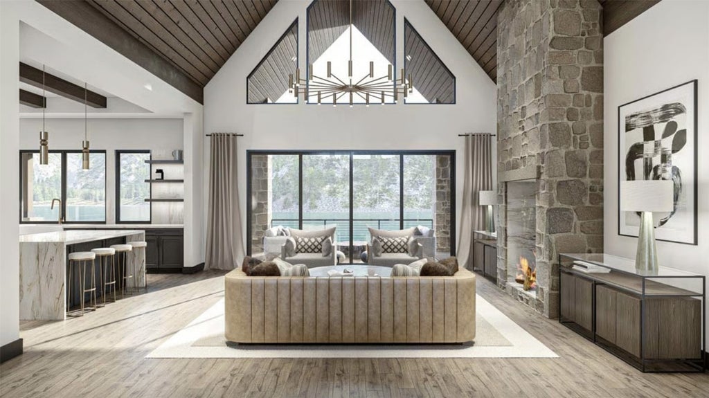 This stunning modern farmhouse showcases a seamless blend of contemporary design and rustic charm. The exterior features a striking A-frame gabled roofline with steeply pitched planes, clad in dark shingles, complemented by a stone veneer base that anchors the structure to its natural surroundings. Expansive floor-to-ceiling glazing, including a dramatic triangular clerestory window, floods the interior with natural light while offering panoramic views of the adjacent landscape. The symmetrical facade is punctuated by deep-set windows and a prominent central entry, framed by a covered portico and accented with a minimalist fire pit. Inside, the open-plan layout boasts a vaulted ceiling with exposed timber beams, creating a grand sense of volume and warmth. The great room integrates a sophisticated dining area with a custom chandelier and a sleek kitchen featuring a large central island with a marble countertop, flanked by dark cabinetry and integrated appliances. Floor-to-ceiling windows enhance the connection to the outdoors, while polished hardwood flooring and a stone accent wall add texture and depth. The space is elevated by natural minimalist finishes, including raw wood accents, smooth plaster walls, and unadorned stone elements, fostering a serene and uncluttered aesthetic that harmonizes with the home’s natural setting. Located in a serene setting with community water access, this property offers a unique retreat for recreation lovers. Featuring a community boat ramp and a marina with leased slips, this blank slate lot is perfect for building your dream home and enjoying aquatic adventures like boating or fishing. The property provides high-speed fiber optic service, a 24/7 staffed guard gate, and access to seven man-made lakes and community parks. Membership with the Omni Barton Creek Country Club at Lakeside or Omni Barton Creek Country