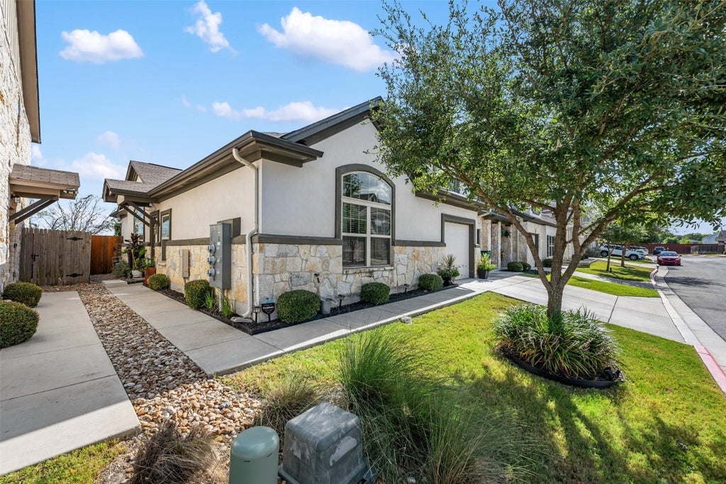 Welcome to 1501 Bedlington Ln — a beautifully updated single-story end-unit townhome in the desirable Smithfield community of Southwest Austin. This rare corner residence offers more privacy, extra yard space, and only one shared wall. Inside, the one-level floor plan places all bedrooms on the main level for easy living. Wide hallways enhance the open feel, and an office/flex room adds versatility. The kitchen features refreshed cabinetry, black hardware, subway tile backsplash, stainless steel appliances (including gas stove and dishwasher), pantry, and pendant lighting with custom paneling. Throughout the home you’ll find engineered wood floors, updated lighting and fans, and smart storage including extended and linen closets plus garage shelving with opener and keypad. Bathrooms shine with modern fixtures and lighting for a clean, cohesive look. Step outside to a private retreat with low-maintenance turf, a composite deck with pergola-style cover, decorative lighting, updated fencing and gates, and a custom AC enclosure. Added touches include a rock pathway, landscaped edging, and refreshed exterior lights. Smithfield offers well-kept townhomes, a true community feel, and a convenient location. Families enjoy nearby Austin ISD schools—Casey Elementary, Paredes Middle, and Akins High—while commuters benefit from quick access to I-35, Mopac, and Capital Metro. Southpark Meadows and local favorites like The Armadillo Den provide shopping, dining, and entertainment just minutes away. With thoughtful upgrades, a single-story layout, corner-unit privacy, and a backyard built for relaxation, 1501 Bedlington Ln delivers both style and convenience in one of Southwest Austin’s most inviting communities.