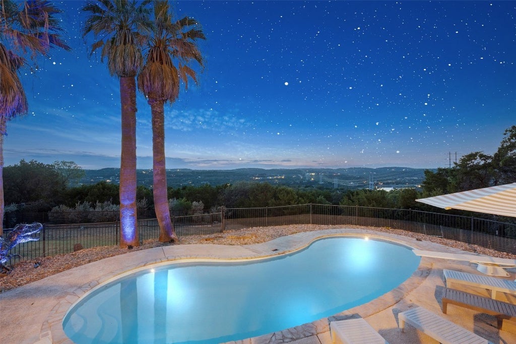 As twilight settles over the Hill Country, the stars emerge above your private hilltop retreat—one acre of serene elevation in coveted Spicewood, Texas, just moments from Rough Hollow Lakeway, where resort-style living and lakeside luxury blend effortlessly. Here, stargazing by the firepit becomes a nightly ritual and sunrises paint the sky above sweeping treetop views. This 4-bedroom, 3-bath haven offers more than 2,300 square feet of soulful living, with a pool that glows under moonlight and a hot tub poised perfectly for evening soaks beneath the palms. Step inside to discover vaulted ceilings, natural wood beams, and rich European oak floors that carry warmth throughout the thoughtfully updated interior. French doors open to the breeze, blending indoor elegance with outdoor splendor. By day, the poolside terrace is your escape—whether lounging under striped umbrellas, listening to cicadas from the hammock, or gathering around the fire table as the sun dips low. Indoors, two wood-burning fireplaces offer cozy bookends to your day, and a secondary upstairs lounge invites creativity, connection, or quiet retreat. The finished garage—complete with heating and AC—makes an ideal studio, gym, or workshop. The kitchen is outfitted with stainless appliances, granite counters, and crisp white cabinetry, while every space feels both current and character-rich. With a very low tax rate, minimal HOA restrictions, and zoning to highly acclaimed Lake Travis schools, this property balances freedom with investment value. You’ll also enjoy private access to a neighborhood boat launch, swim dock, and scenic park—your gateway to lake days and Hill Country adventure. Come home to something extraordinary—where every view is a masterpiece, and every day feels like a getaway.
