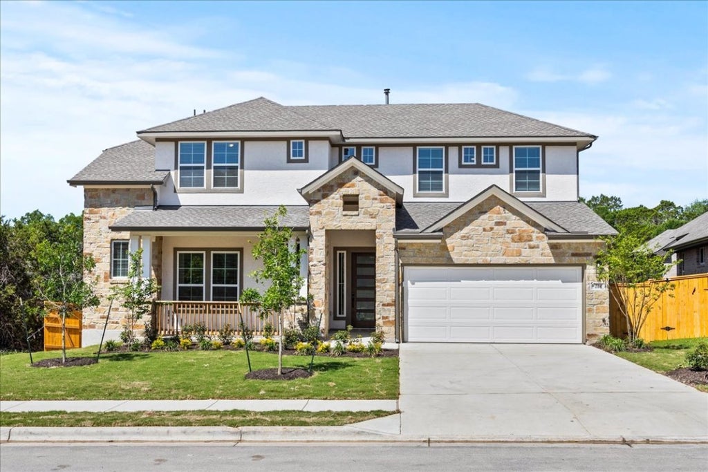 Meet the HEIDI plan by Chesmar Homes! 2-story family home with the open concept WOW FACTOR on an oversized lot, greenbelt lot! This 4 bedroom, 3 bath home also features a game room and built-in desk area upstairs. 8' doors on first floor throughout. Chef's kitchen with built-in appliances, 36" gas cooktop, and enormous island built for entertaining. Family room features vaulted ceiling with beam detail and a 60" contemporary fireplace. Private primary suite on main floor offers French doors leading to the bath, contemporary freestanding soaking tub, oversized walk-in mudset shower with tile to the ceiling. A secondary bedroom with full bath perfect for guests on first floor. Game room, two bedrooms and full bath on second floor. Covered patio off the family room carries the vaulted ceiling and features stone walls. Experience the Chesmar Homes difference located in the stunning master-planned community of 6 Creeks at Wateridge. Come live at the gateway to hill country with mature trees, luxury amenities, and more.