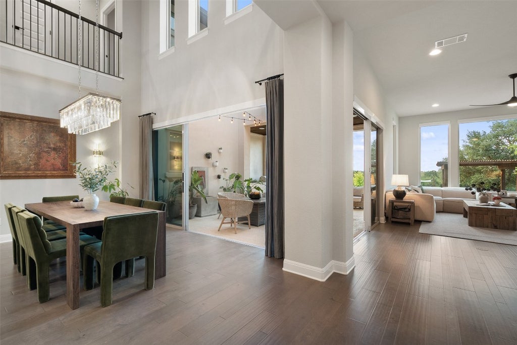 Homes like this - with every detail in place and views to match - are a rare opportunity in Grand Mesa. This Drees Lynmar II offers the privacy, layout, and thoughtful design that buyers wait for but rarely find. The moment you enter, the resort setting and views command your attention. Overlooking 120+ acres of private terrain, floor-to-ceiling windows and sliding glass doors flood the living spaces with natural light and frame the view like artwork. The dramatic 2-story foyer leads into the formal dining, living, and gourmet kitchen. The opulent kitchen features custom cabinetry, quartz counters, top-of-the-line appliances, and a walk-in pantry in addition to the versatile butler’s pantry that works equally well as a prep station, coffee bar, or appliance hub. The main level owner’s retreat offers breathtaking vistas and an ensuite bath that exudes elegance - separate vanities, a soaking tub, an oversized dual-entry spa shower, and a boutique-style dressing room w/ direct access to the laundry room. From the great room, you’ll enter to a private courtyard, seamlessly transitioning to a covered patio & unveiling the backyard masterpiece. The patio boasts an outdoor kitchen equipped with Bull appliances and built-in speakers, ensuring year-round enjoyment. The stunning pool is a centerpiece, featuring a tanning deck, submerged barstools, and a spa with tranquil waterfall features. Complementing the allure of this entertainers’ home are a pergola-covered gas firepit, a second-level travertine-tiled balcony, a landscape architect-designed playground with pre-planned sport court dimensions, and a fully furnished theater with a short throw projector and AV equipment. Four secondary bedrooms, three with ensuite baths, provide private accommodations, including a downstairs guest suite with a full bath that offers direct outdoor access, making it a perfect pool bath or separate guest quarters.